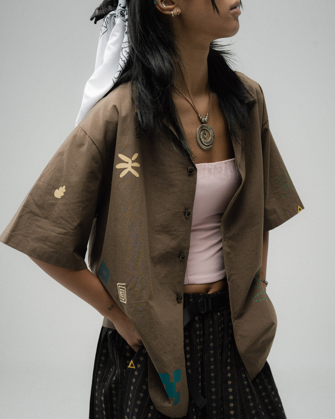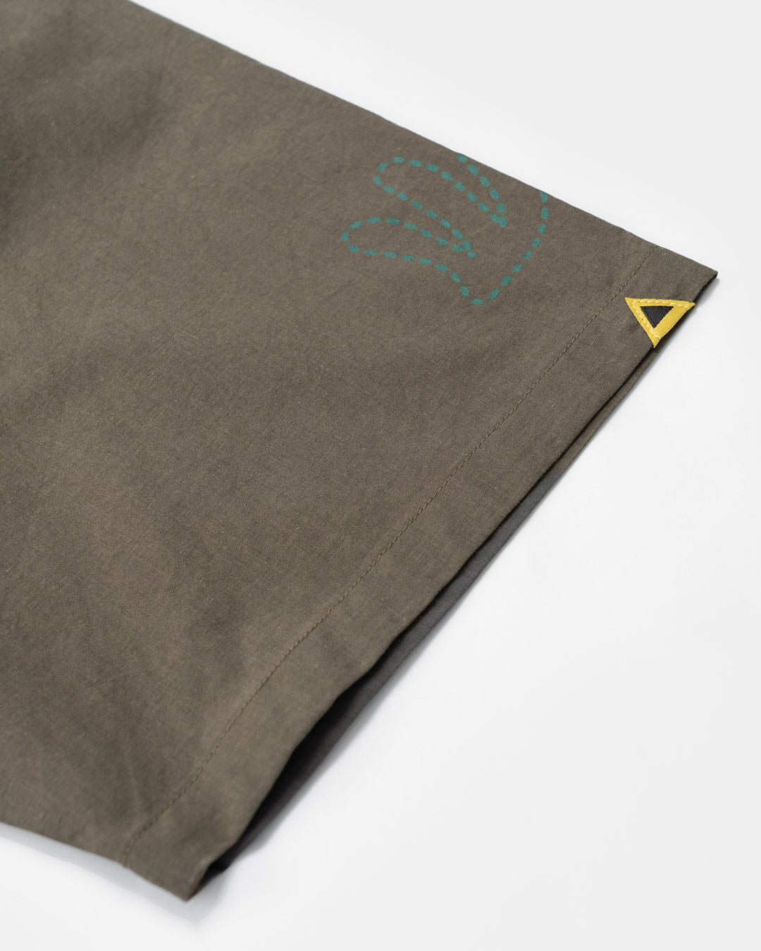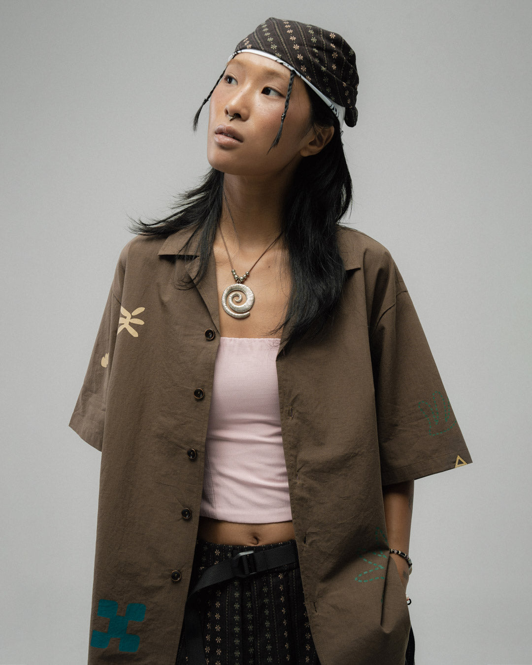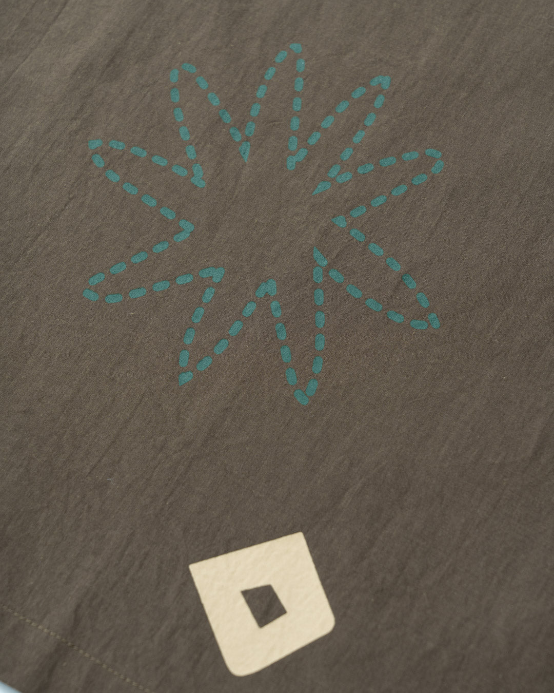 Lightweight fabric with printed and embroidered collection symbol graphics.