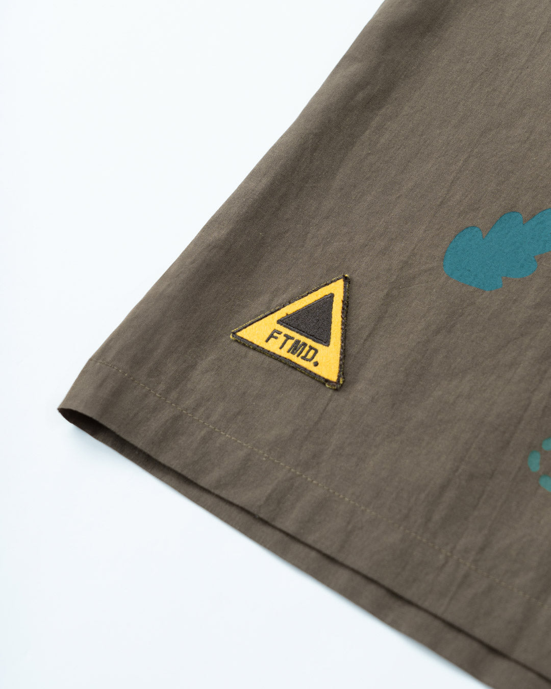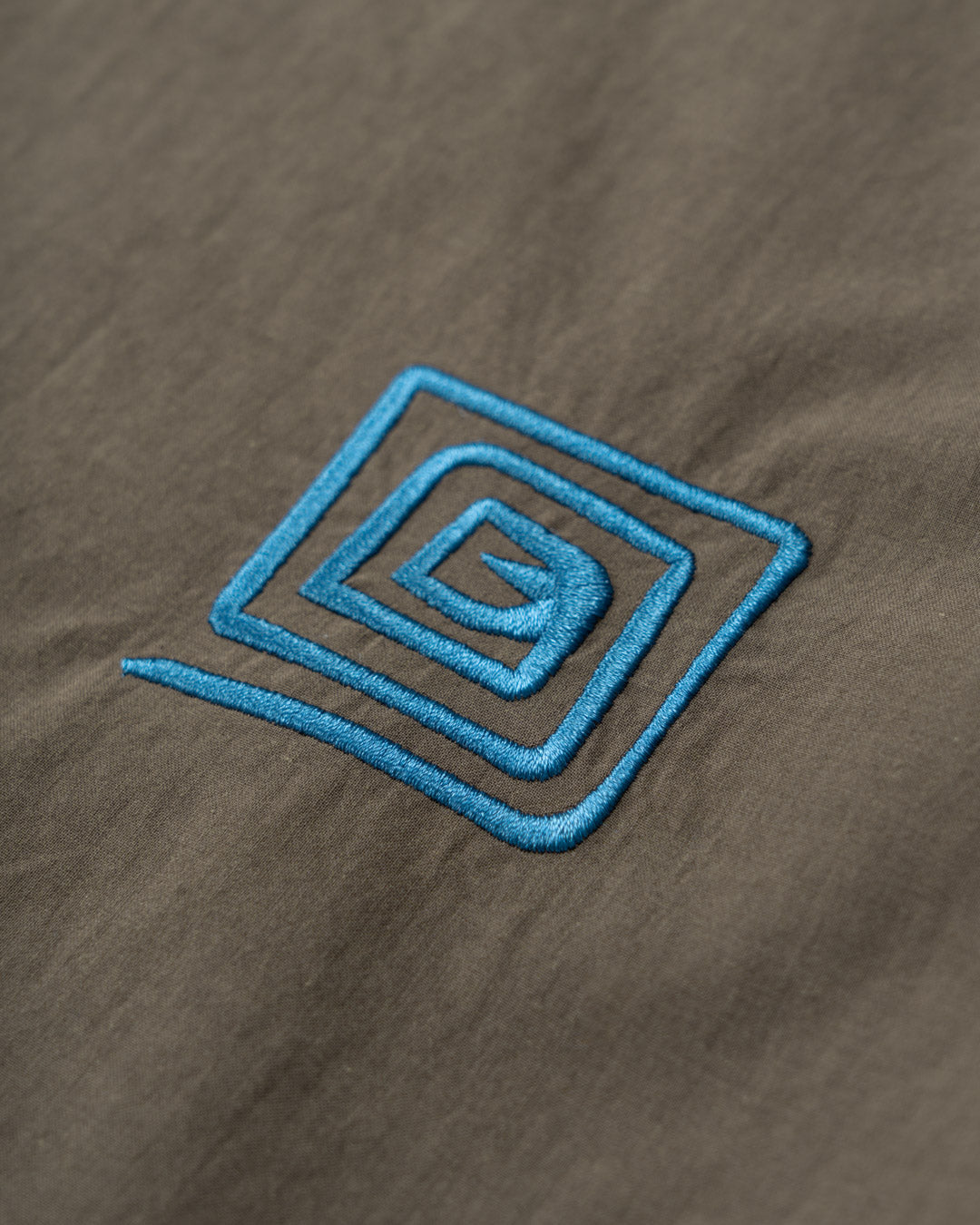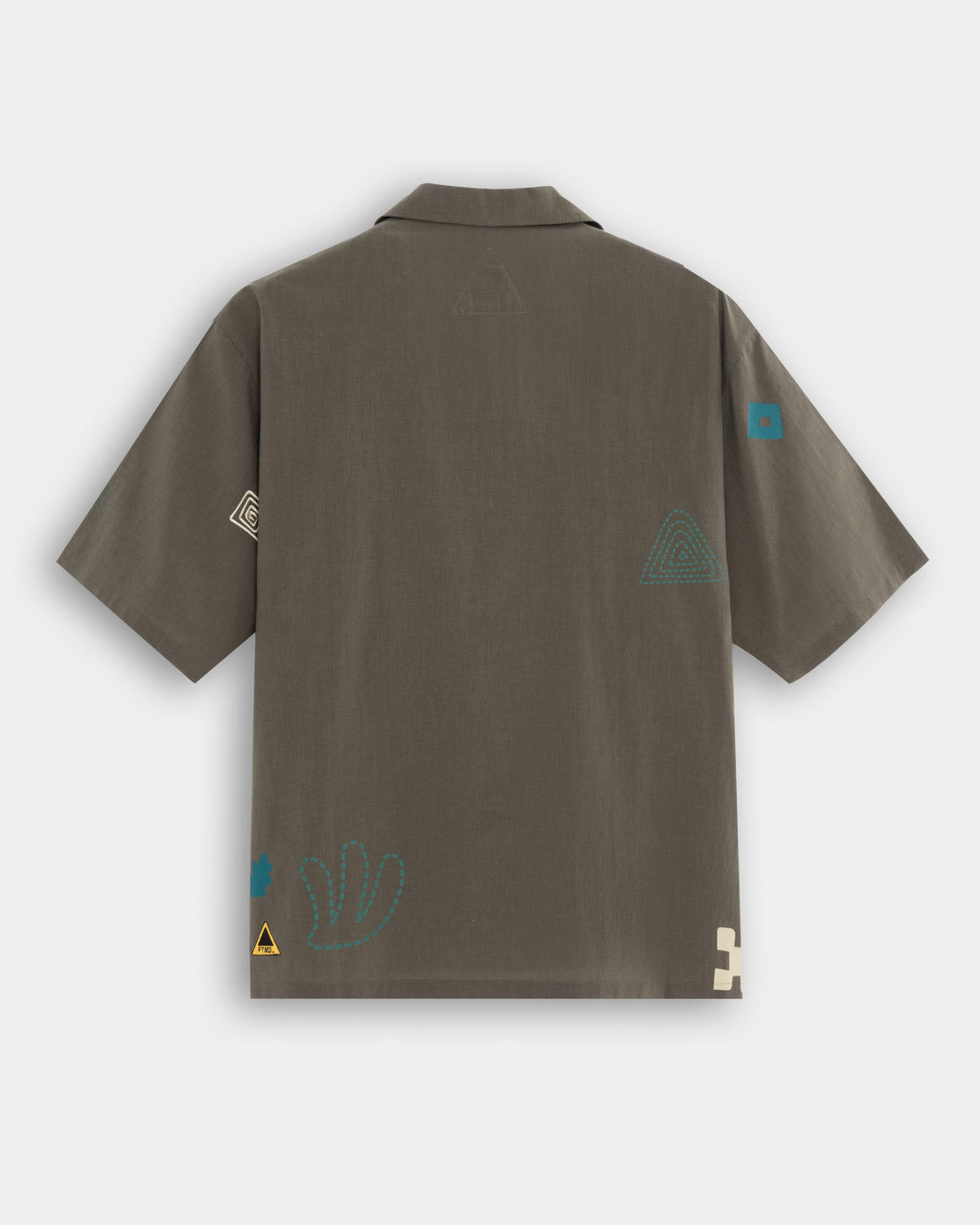 Lightweight fabric with printed and embroidered collection symbol graphics.