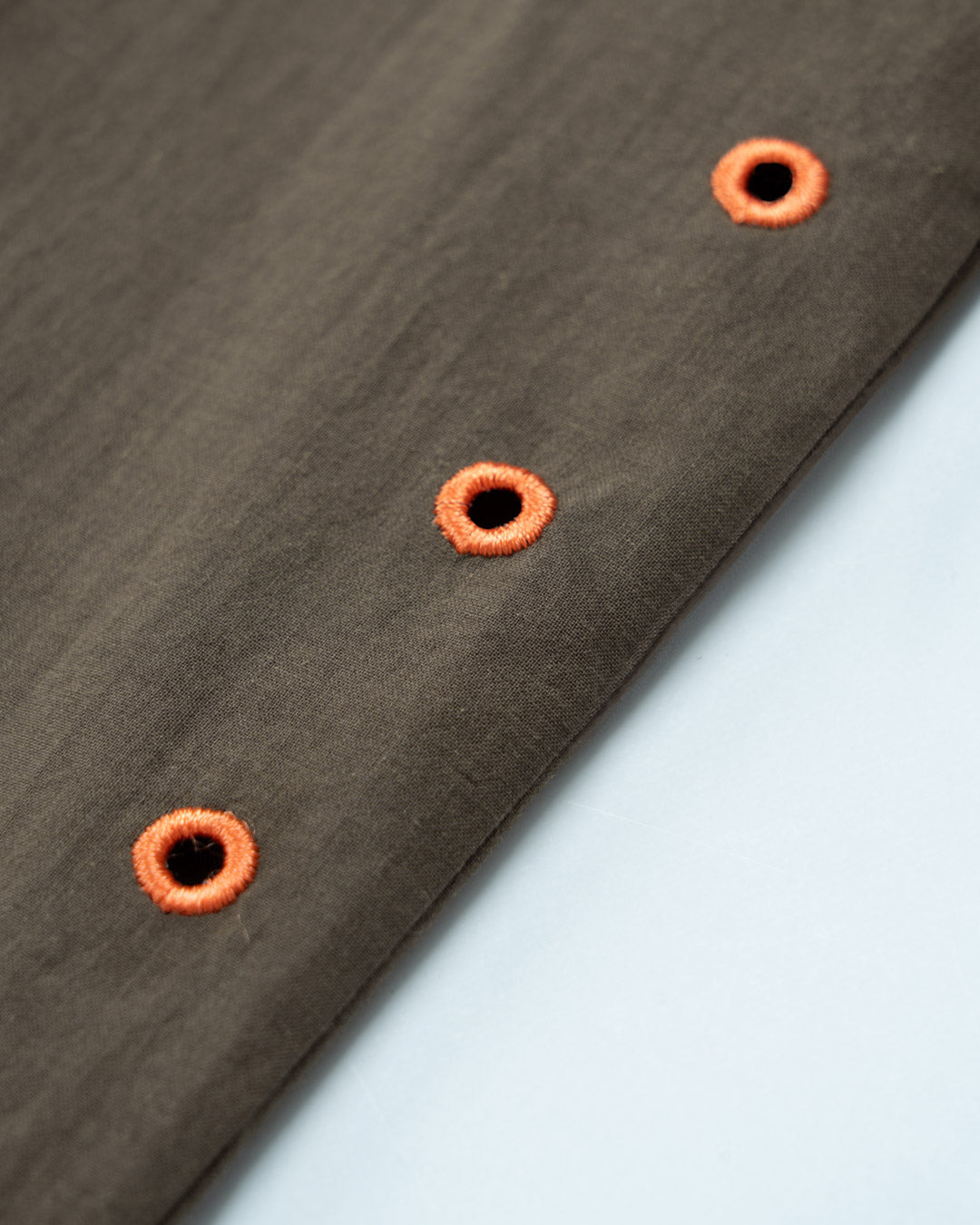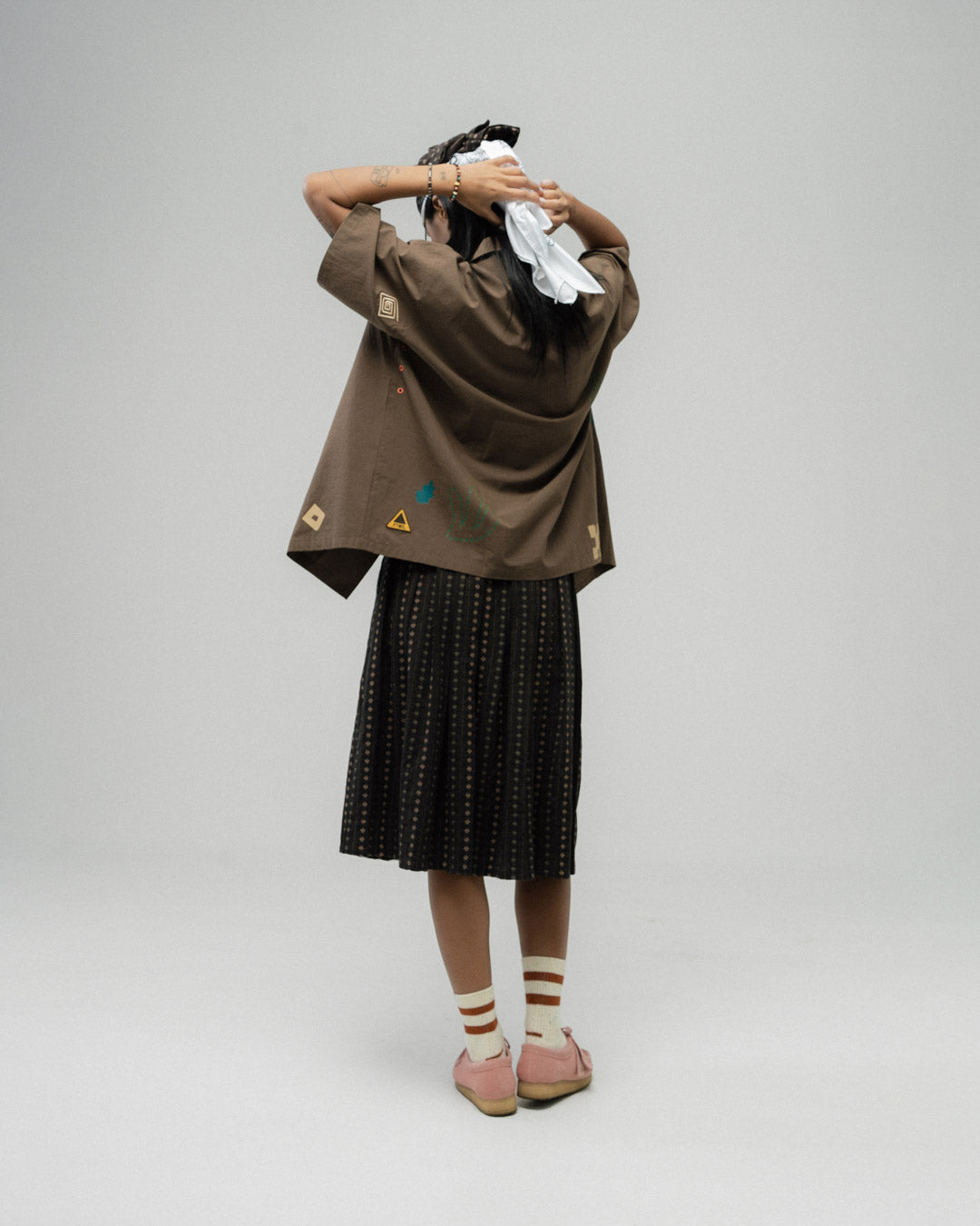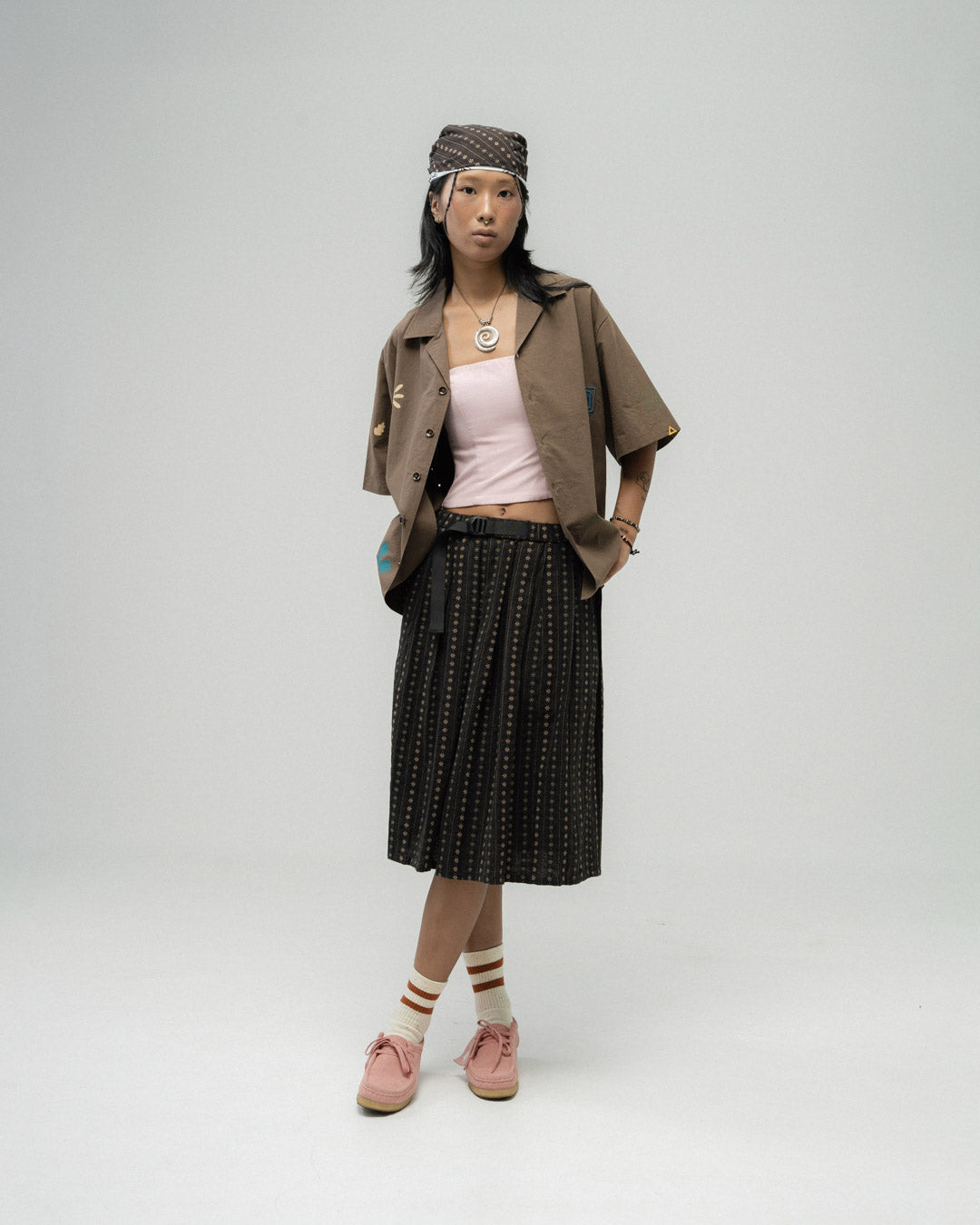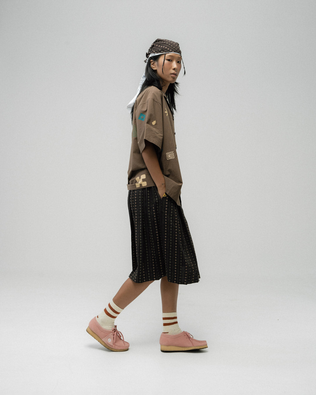 Lightweight fabric with printed and embroidered collection symbol graphics.