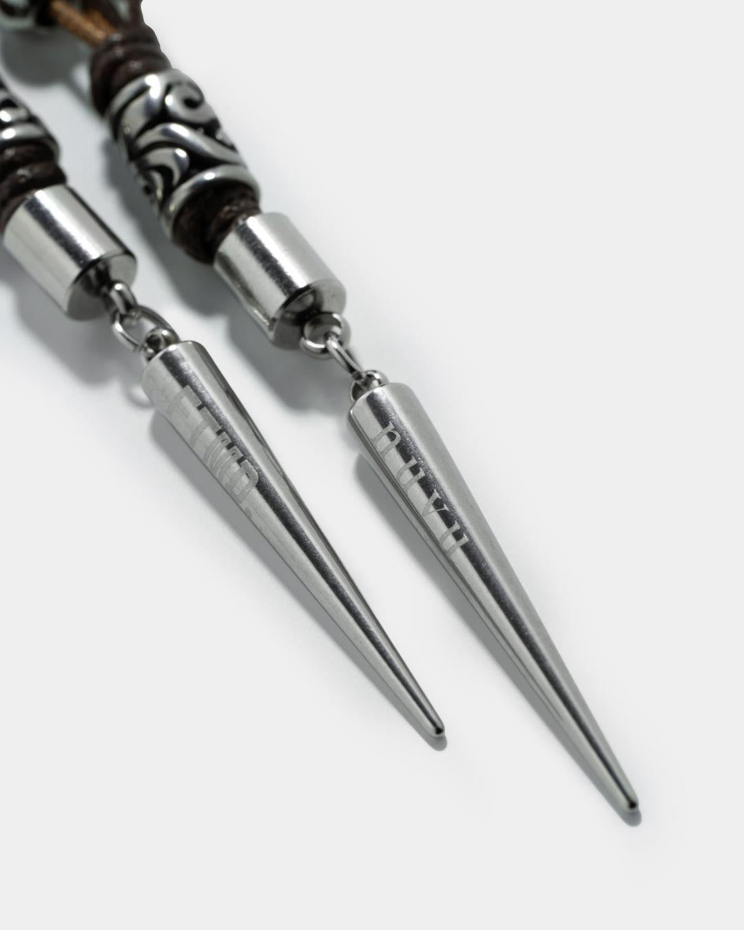 Pendant drop detailed with engraved logo.
